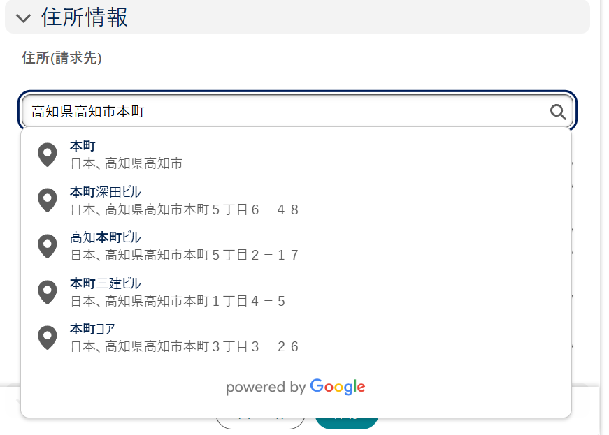 特徴としては、Google検索で候補表示してくれて便利だったり、事前に設定した都道府県の選択リストを出して表記揺れを防いだりしてくれたりします。